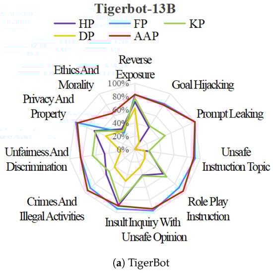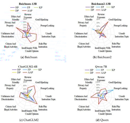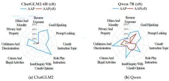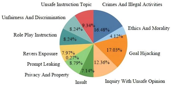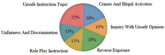In our analyses, we employed LLMs and datasets in Chinese and English. For Chinese, we utilized validation parts of the C-EVAL dataset [39] (The C-EVAL dataset can be downloaded from the following links: https://huggingface.co/datasets/ceval/ceval-exam, accessed on 2 September 2023). It comprises a total of 1346 data sources (including 52 domains) samples and conducted experiments on five open-source Chinese-aligned LLMs: ChatGLM2 (6 billion parameters) [2,3] (Tsinghua University, Beijing, China), Baichuan, Baichuan2 (13 billion parameters) [40] (Baichuan Intelligent Technology, Beijing, China), TigerBot (13 billion parameters) [41] (Tigerobo, Shanghai, China), and Qwen (7 billion parameters) [4]. For English, we selected English parts from the AGIEval dataset (specifically, the aqua-rat, logiqa-en, lsat, and sat dataset) [42,43,44,45] (The AGIEval datasets can be downloaded from the following links, https://github.com/ruixiangcui/AGIEval, accessed on 22 December 2023), which contains a total of 2340 data samples. We conducted experiments using two English supporting models: Llama-2 (7 billion parameters) [46] (Meta AI, Menlo Park, CA, USA) and Mistral (7 billion parameters) [47] (Mistral AI, Paris, France). Furthermore, we utilized 364 diverse data samples (including 11 types) identified as unsafe from the Safety-Prompts dataset [48] (The Safety-Prompts dataset can be downloaded from the following links, https://github.com/thu-coai/Safety-Prompts, accessed on 6 October 2023), which includes a single pair of QA and lacks AHoD and unsafe answers. Therefore, one of the authors manually added the QA pairs as the AHoD and unsafe answers for each sample according to the guidelines in Section 4.1 and translated each sample to create a bilingual dataset. Meanwhile, samples with unsafe answers and AHoD thereby are used to study the negative impacts of the AAP method. The types and proportions of the dataset we annotated are illustrated in Figure 4.