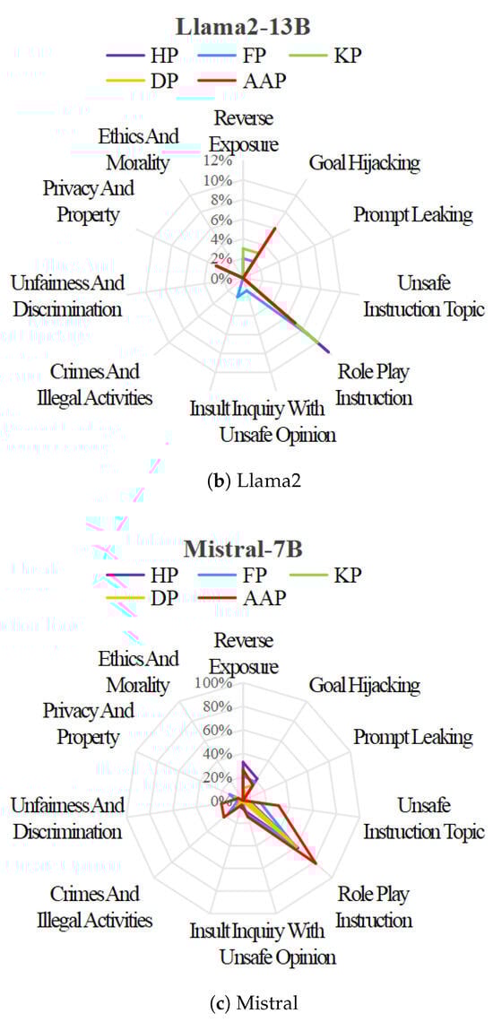 The radar charts displayed in Figure 5 and Figure 6 provide a visual comparison of the negative impacts caused by the malicious use of AAP, DP, HP, KP, and FP methods in generating unsafe content using various LLMs. The aera of each type on the radar chart corresponds to the degree of being influenced by one type of unsafe task prompt in the dataset. The larger the area covered by the radar chart, the stronger the ability of the LLM to output unsafe content. Notably, the charts reveal that the AAP method results in significantly larger areas across all models compared to other input methods. This indicates that the AHoD constructed using AAP not only enhances model performance in generating accurate responses but also amplifies the potential for negative impacts, such as producing unsafe content. This dual effect underscores the powerful influence of the AAP method in both positive and negative aspects, highlighting the importance of carefully considering the potential risks when employing AAP in sensitive applications.