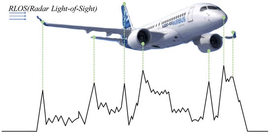As an electromagnetic device capable of responding to a variety of observation conditions, radar has been widely employed in the fields of target detection, tracking, and recognition [1,2,3]. As the bandwidth of the radar increases, more detailed target information can be captured by the radar. The target echoes from wideband radar can be processed into a high-resolution range profile (HRRP), which is the projection of the target’s main scattering center along the radar line of sight (RLOS) [4], as shown in Figure 1. In comparison to synthetic aperture radar (SAR) and inverse synthetic aperture radar (ISAR) images, the acquisition, processing, and storage of an HRRP are more efficient [5,6]. And, it contains rich structural information about the target, such as the radial length and the number of scatter centers. Due to these advantages, it occupies a dominant position in the field of radar automatic target recognition (RATR), and recognition methods based on HRRPs have received much attention in RATR [7,8,9,10,11,12,13,14,15].