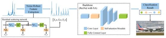 High-quality HRRP samples are usually selected for training since the classification performance of the network is data-driven. That is, training data are obtained from cooperative targets with high SNRs. However, the SNRs of test samples may be much lower in practical circumstances. This is particularly evident for distant targets with small radar cross-sections (RCSs), where the echo exhibits a low SNR, leading to a distribution of scatter centers that differs from the training data. Additionally, the presence of non-cooperative targets exacerbates this challenge. To deal with this issue, many researchers have proposed noise-robust recognition methods based on statistical models. In [25], the authors make an assumption about the statistical properties of the HRRP’s range cells, but this prior assumption is not entirely appropriate for an HRRP in a low-SNR scenario. Therefore, there are other researchers who removed the noise by reconstructing the HRRP to improve the noise robustness. Du [26] reconstructed the position and amplitude of the target scatter centers based on sparse theory and employed these features for matching in order to achieve recognition, but the performance was limited by the model fitting ability. In addition to the aforementioned traditional machine learning methods, deep learning methods have also been employed for the purpose of HRRP denoising. Liu [27] designed a generative adversarial network for denoising but increased the complexity of the model. Existing network-based methods demonstrate some robustness to noise, but they do not specifically address the noise component in the HRRP. To tackle this problem, a residual scattering network is proposed in this paper. The scattering network first proposed by Mallat has fixed parameters that do not need to be learned from the data, and the extracted features are translation-invariant and deformation-stable [28].