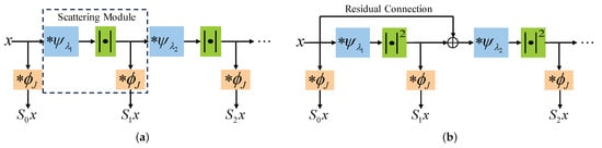 Architecture of scattering network with two layers. (a) Original scattering network. (b) Residual scattering network.