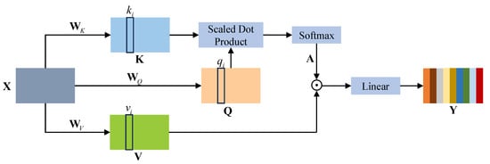 Then, the self-attention coefficient matrix can be computed by the scaled dot product of and , which can be formulated as follows: