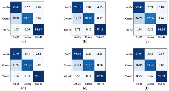 This section will present the results of recognition experiments conducted on Dataset1 and Dataset2, with the purpose of evaluating the recognition performance of the proposed RSAN. In order to fully demonstrate the advantages of the RSAN, a comparison will be made with five recognition methods, including 1D-CNN [10], TARAN [9], TACNN [10], AlexNet, and ResNet18. With the exception of TARAN, all of the aforementioned comparison methods extract structural features for the HRRP, which is similar to the RSAN. Instead, TARAN discriminates targets by constructing the temporal correlation within the HRRP. Therefore, a comparison with these methods will provide a more comprehensive demonstration of the recognition performance of the RSAN. To quantitatively evaluate the performance of each model, we adopt the overall accuracy (OA), the per-class accuracy (PA), and the confusion matrix as indicators.