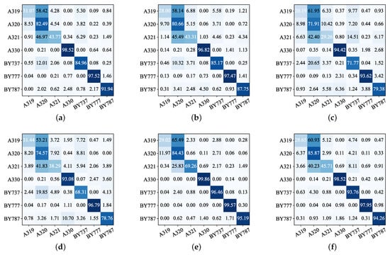 Confusion matrix comparison of different methods on Dataset2. (a) 1D-CNN; (b) TACNN; (c) TARAN; (d) AlexNet; (e) ResNet18; (f) RSAN.