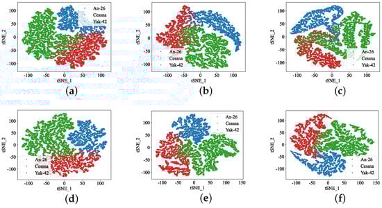 Two-dimensional t-SNE visualization of extracted features for different methods on the test set of Dataset1. The horizontal and vertical axes, respectively, represent the normalized amplitudes of the first and second dimensions of the dimensionality-reduced feature vectors. (a) 1D-CNN; (b) TACNN; (c) TARAN; (d) AlexNet; (e) ResNet18; (f) RSAN.
