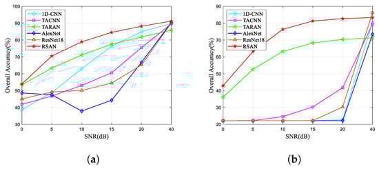 In practical scenarios, the maneuvering of the target can lead to the unstable tracking of non-cooperative targets due to the lack of advanced knowledge of their flight paths. This means that the radar echoes may lose pulses, subsequently affecting the SNR of the target HRRP obtained after accumulation. This phenomenon is particularly prevalent in the case of non-cooperative targets with small RCSs and remote distances. In this section, the recognition performance of the RSAN in noisy environments is evaluated by adding Gaussian white noise to the test sets of both Dataset1 and Dataset2, thus constructing test data with different SNRs. In order to adequately evaluate the model’s ability to maintain a certain recognition rate when the distribution of the noise-affected test data exhibits a notable divergence from that of the training data, we did not add noise to the training data. Specifically, we only added Gaussian white noise with SNRs of “0 dB”, “5 dB”, “10 dB”, “15 dB”, and “20 dB” to the test sets and carried out experiments. For each experimental group, the noise-adding operation is repeated five times, and the OA for each method is the average of the five recognition accuracies to addresses the uncertainty caused by the randomness of noise. The formula of the SNR can be expressed as follows: