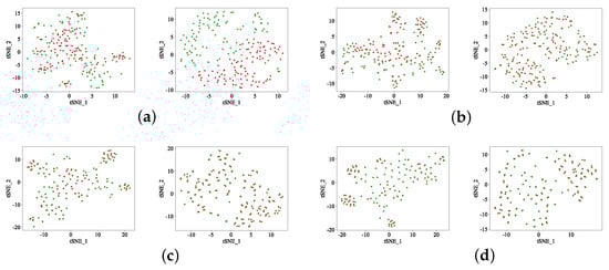 Two-dimensional t-SNE visualization of scattering features for An-26 at SNRs of (a) 5 dB, (b) 10 dB, (c) 15 dB, (d) 20 dB. For each set of subplots, the projections of the original HRRP versus the noise-added HRRP are displayed on the left, and the projections of the original scattering features versus the noise-added scattering features are displayed on the right. In these figures, red and green represent the noise-free and noise-added data, respectively.