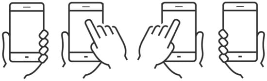 In 2013, Steven Hoober conducted a survey by observing 1333 people in public places (e.g., streets, airports, bus stops, cafés, trains, and buses) to analyze how they interact with their smartphones []. People nowadays use their mobile devices in many different scenarios (for example, while walking, riding a bus, or standing still), and adapt their grip on the smartphone accordingly. Hoober’s observations revealed that 49% of people hold their phone in one hand, 36% hold it cradled (one hand holding the phone, one hand interacting with the touchscreen—either with the thumb or the index finger), and 15% use two hands.