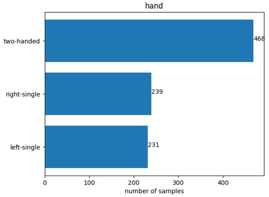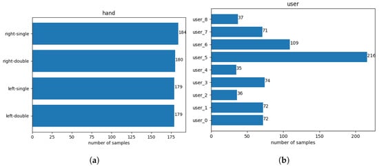 In total, nine participants contributed to the final dataset (seven male, two female), between the ages of 23 and 58, all of them right-handed. This should not be too concerning. Right-handed individuals may use their smartphone with their non-dominant hand in certain situations, such as when their dominant hand is occupied—for example, holding the smartphone with their left hand while retrieving keys from their pocket with their right hand []. This indicates that non-dominant hand usage is a familiar interaction for participants, contributing to the reliability of the posture data collected. The dataset consists of 723 rows (samples) and 1204 columns (1202 features + username + holding posture). The target variable is nearly uniformly distributed, as seen in Figure 3a, while the participants tapped at different frequencies on the touchscreen, as visualized in Figure 3b.