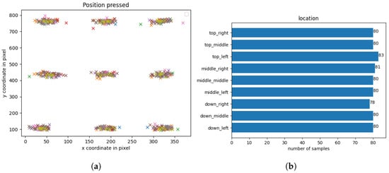 (a) Actual X and Y coordinates of all tap gestures in the dataset. (b) Number of samples per location (dataset split into nine different locations categorized by the labels displayed in the app).