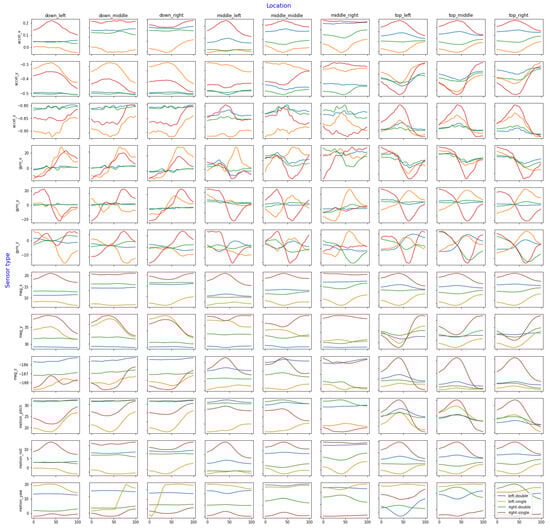 The whole dataset is visualized in Figure 5. The Y-axis consists of all different sensors and axes for each sensor while the X-axis contains the nine labeled locations where the users tapped the screen. These groupings are important, as different locations yield different sensor values. For example, using the smartphone right-handed and attempting to tap a button at the bottom-right corner of the phone often causes a slight rotation in the pitch axis, where the top of the smartphone will tilt down most of the time. On the other hand, trying to tap a button located at the top-left corner (such as the classic back button on an iPhone) also causes a pitch-axis rotation, but in this case, the top of the phone tilts upward (toward the user, toward the thumb). This movement can also be seen in other sensors, such as the gyroscope or accelerometer. For this reason, it is best to group the charts by sensor axis and location to determine whether the target variables are visually distinguishable. The figure shows every sensor and location; although some axes may be less important than others, it is still necessary to compare all the recorded data.