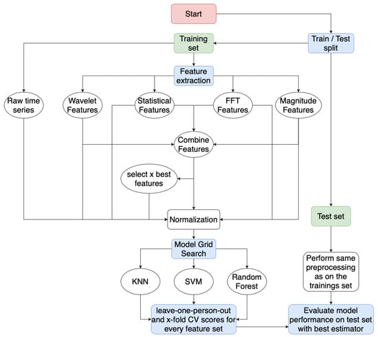Various data preprocessing and feature extraction methods have been applied, including statistical features of the raw time series, FFT, wavelet transform, and magnitude features. After normalizing the features, a total of 74 different feature sets were constructed to analyze different sensors, axes, and feature extraction methods.
