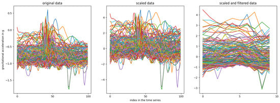 Comparison of the raw time series data from the accelerometer’s Z-axis with the scaled time series data using a custom scaling implementation, as well as the scaled and filtered data.