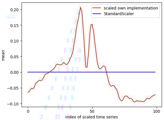 Comparison of the mean values of a time series (accelerometer z-axis) after being scaled with different scaling implementations.