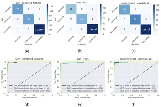 Confusion matrix and ROC curves for three different models: The SVM with combined features and a 0.8 correlation filter (a,d), the SVM with PCA features and a 0.9 correlation filter (b,e), and the RF with all wavelet features, a 0.9 correlation filter, and a 100 ms cutoff (c,f). All models used the dataset with three holding postures.