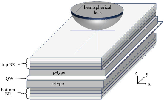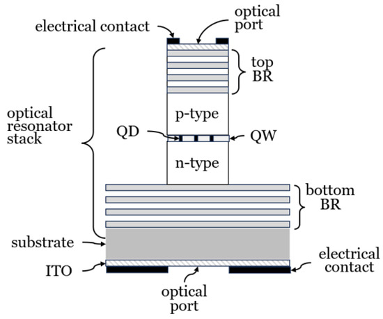 Quantum dots (QD) are fabricated in a semiconductor quantum well (QW) layer between a p-type and an n-type cladding layers, generally built on a GaAs substrate. It is noted that the structure is, in fact, a semiconductor diode having top and bottom electrical contacts.