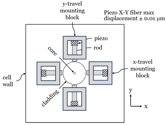 Lensed optical fiber fine alignment. The optical fiber is represented by the core and cladding. x- and y-mounting blocks, fixed to the upper wall exterior, enable piezoelectric actuation of push rods to translate the optical fiber so as to maximize photon collection efficiency.