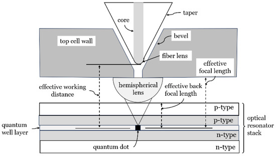 Simplified side view of the optical system designed to optimize the channeling of entangled photon pairs emanating from a quantum dot in a quantum well layer formed between a p-type and an n-type compound semiconductor stack that comprises an optical field resonator shown in detail in Figure 1 and Figure 2. The tip of the lensed optical fiber is represented by the tapered cladding and core fitting in a beveled access port in the top wall of the anvil cell.