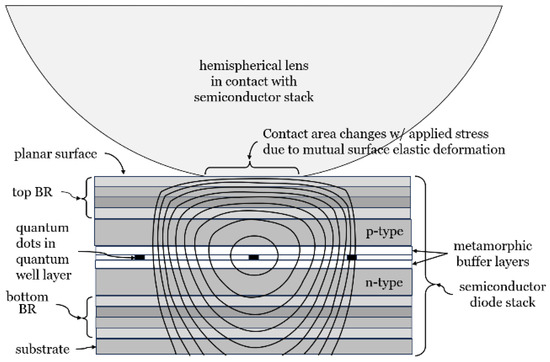 Section 2 describes the fabrication of deterministic semiconductor sources of entangled photons based on InxGa(1−x)As quantum dots comprising (1) an optical resonator cavity to maximize photon production [16], (2) means to locate an individual QD source sufficiently isolated from neighboring QD sources [17,18], (3) an anvil cell construction and operation designed to generate a shear strain in a subsurface volume that contains one and only one quantum dot source, (4) efficiently channel the entangled photon pairs generated by a specific quantum dot into a single mode Telecom optical fiber, and (5) means to cryogenically cool the subject QDs to about 10 K while applying the necessary external stress.