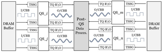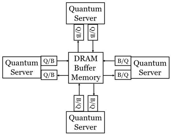 Figure 13 depicts a networked group of quantum servers that may be configured to solve a problem by the strategy of “divide and conquer”. See, for example, references [36,37]. The DRAM buffer supplies classical bits to quantum servers as requested. The “Post-QS Data Processor” has two principal tasks. (1) Conversion of the readout bit to some standard voltage level. (2) Reconstruct a high-fidelity solution from the previously divided parts solved separately in accordance with the instructions of an algorithm (e.g., [36]) whose authors also recognize similar barriers to scaling the size of a monolithic quantum computer, as discussed in the Introduction of our M/S. Reference [36] introduces a Quantum Divide and Conquer Algorithm comprising a “hybrid variational approach to mapping large combinatorial optimization problems onto a distributed quantum architecture composed of many networked quantum computers”.