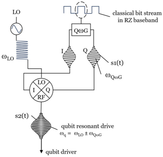 A classical bit, represented by the circled return-to-zero pulse in Figure 10, is converted by a Quadrature frequency Generator (QωG) to a time-limited envelope, S1 (t), quadrature microwave signal at a first frequency, ω1, comprising Sin (ω1t) and Cos (ω1t) components. A second microwave frequency, ωLO, is generated by a local oscillator (LO). A quadrature mixer combines the two signals to generate a second pulse envelope, S2 (t), temporally limiting the mixer output frequency ωq = ωLO ± ωQωG in resonance with the target qubit.