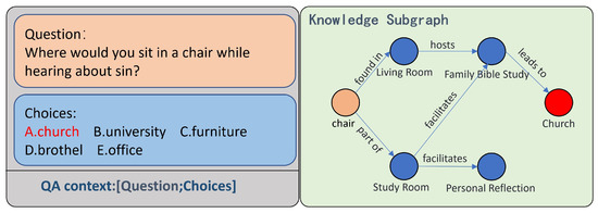 Commonsense question answering (CSQA) is a challenging task. To solve commonsense questions, people usually extract the knowledge contained in the question text as a constraint in the reasoning process [1]. Therefore, pretrained language models, as popular methods for obtaining text representations in recent years, have been introduced for CSQA tasks [2,3]. Although pretrained language models possess strong text comprehension capabilities and naturally contain a certain level of commonsense knowledge through training data, they struggle when faced with the vast amount of commonsense and structured data in the real world. Knowledge graphs, as structured knowledge representation methods, not only provide a large amount of commonsense knowledge but also support complex logical reasoning [4]. In order to use the relevant knowledge in a knowledge graph to solve commonsense problems, researchers have introduced graph neural networks [5,6,7] to embed and reason about the structured knowledge in a knowledge graph. Therefore, in recent studies, graph neural networks have been introduced into question-answering systems and combined with pretrained language models, which has developed into a trend for solving commonsense question-answering problems [8,9,10].