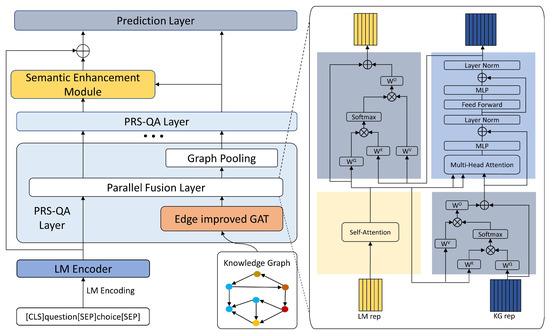 The problem with this approach is that there is isolation between the text representations obtained by the pretrained language models and the graph representations generated by the graph neural networks, lacking an effective integration mechanism. Consequently, recent research has focused on building a bridge between the two to enhance the synergy in the reasoning capabilities between text and graph representations [14,15,16,17]. On the other hand, in an attempt to make the subgraphs retrieved from the KG contain as much relevant information as possible related to the question, the retrieved subgraphs often encompass numerous entities and relationships unrelated to the answer. These noncritical details can interfere with the accuracy of the model’s reasoning. Therefore, reducing the impact of these noise nodes on the reasoning process is also a current research direction. Although existing methods that combine LM and KG for CSQA have made considerable progress, they still face the following three issues: (1) The interaction between the two representation modalities is not sufficient, and the accuracy of removing noise nodes needs to be improved to avoid removing relevant nodes. (2) When predicting answers, only a single semantic representation is used, lacking the integration of whole-graph information to guide the choice of answers. (3) In previous models, relationship types were represented by one-hot vectors, which inherently lack semantic information, thereby limiting the model’s reasoning capabilities. Based on the above considerations, inspired by the Mobile-Former [18] model in the field of computer vision, we propose a novel bidirectional interactive model, PRS-QA (Parallel Fusion, Relation Embedding Optimization, Semantic Enhancement, and Question Answering), which is based on self-attention and multihead cross-attention, to improve the information transfer ability between question representation and graph representation, and we use the multihead attention score as the basis for the graph pooling layer to delete irrelevant nodes. Simultaneously, we aggregate global graph information to boost the semantic representation of question text, thereby improving the predictive layer’s reasoning capabilities for answers. Inspired by TransE [19], we enhance the semantic representation of the edge by utilizing the representation difference between the tail node and the head node, and we determine the final representation of the edge based on the relevance of the edge to the question.