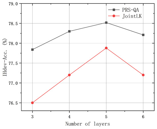 To investigate the impact of the number of layers in the graph neural networks on model performance, we conducted comparative experiments using PRS-QA models with various layers on the validation set of the CommonsenseQA dataset, with the results shown in Figure 4. The results show that the accuracy on IHdev was 77.84% with a three-layer model; it increased to 78.30% with four layers and peaked at 78.52% with five layers. However, further increasing the number of layers caused a decline in accuracy. This indicates that while adding more layers can enhance the model’s learning capacity, excessively stacking layers may lead to overfitting or other adverse effects.