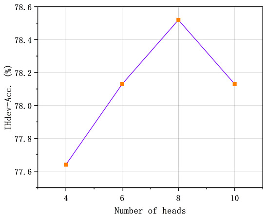 Impact of the number of attention heads on the CommonsenseQA IHdev set.