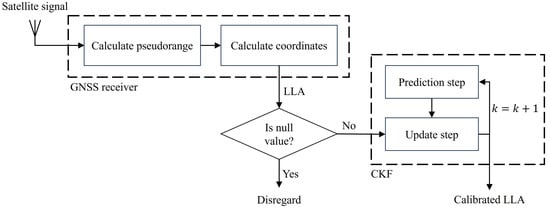The conventional outdoor positioning system receives 3D coordinates from a GNSS receiver, which are processed through a CKF to obtain calibrated coordinates as shown in Figure 1. The CKF improves the positioning accuracy by reducing measurement noise and calibrating the estimated positions. However, in urban areas, the CKF may receive data that contain outliers due to the signal blocks from buildings, multipath effects, weather conditions, and other factors [6]. The performance of a CKF may be degraded if such anomalies are not removed. Therefore, to improve the positioning performance, it is important to handle the outlier removal method with a CKF.