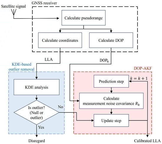 In this section, two main methodologies of the proposed 3D outdoor positioning system are presented: (1) the KDE-based outlier removal method, which effectively removes anomalies using a sliding window technique, and (2) the proposed DOP-AKF, designed to enhance the positioning performance in both LOS and NLOS environments. A schematic diagram of the proposed 3D outdoor positioning method is shown in Figure 3. The and LLA are calculated within the GNSS receiver by using the received satellite signals to measure the pseudorange to each satellite and then combining it with the satellite position information at each time k.