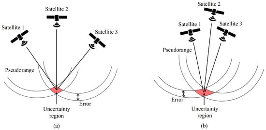 DOP is a metric of positioning accuracy determined by the geometric arrangement of satellites relative to the GNSS receiver. The ideal satellite array occurs when one satellite is directly above the user and the remaining three satellites are evenly distributed near the horizon [21]. When the satellites are uniformly distributed, as shown in Figure 4a, the DOP value is low, while an uneven distribution, as shown in Figure 4b, results in a high DOP value. In the GNSS, the position of a receiver is calculated using the measurements of its pseudorange from multiple satellites. The pseudorange for each satellite is defined as follows:
