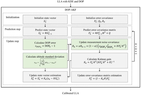 In Figure 5, a flowchart of the DOP-AKF algorithms is presented. In this paper, the initial measurement vector , containing the LLA coordinates, is assumed to be low noise. The initial value of the measurement noise covariance matrix is set to 0.001 and is adaptively updated at each time step.