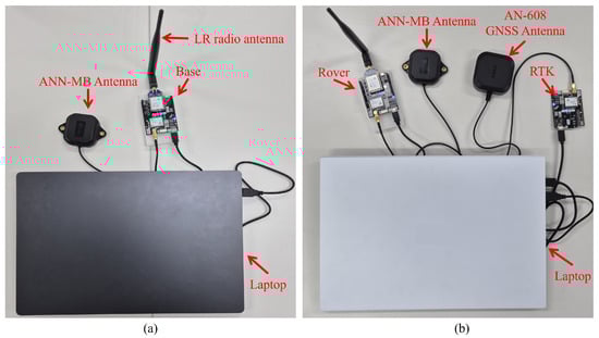 Experiment system components with ZED-F9P: (a) base in DGPS mode (b); rover in DGPS mode and RTK.