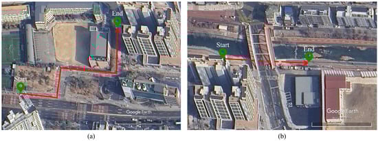 The experiments were conducted in an urban area located in Nowon-gu, Seoul, Korea, which is shown in Figure 7; the weather was clear, and the temperature was stable at 20 degrees. The experimental route in Figure 7a was considered as representative of a mixed environment, which is flat terrain consisting of high-rise and low-rise buildings with NLOS characteristics. Signal interference, reflection, and diffraction may occur due to the varying building heights, resulting in multipath propagation and a partial blockage of GNSS signals. These factors may lead to signal anomalies and measurement errors similar to typical NLOS conditions. Therefore, this region is suitable for testing KDE-based outlier removal methods as it may provide a realistic scenario where outliers can be present. The experimental route in Figure 7b is a kind of path that goes through an overpass bridge. This region is suitable for evaluating the performance of the DOP-AKF as it is flat terrain that transitions from LOS to NLOS conditions.