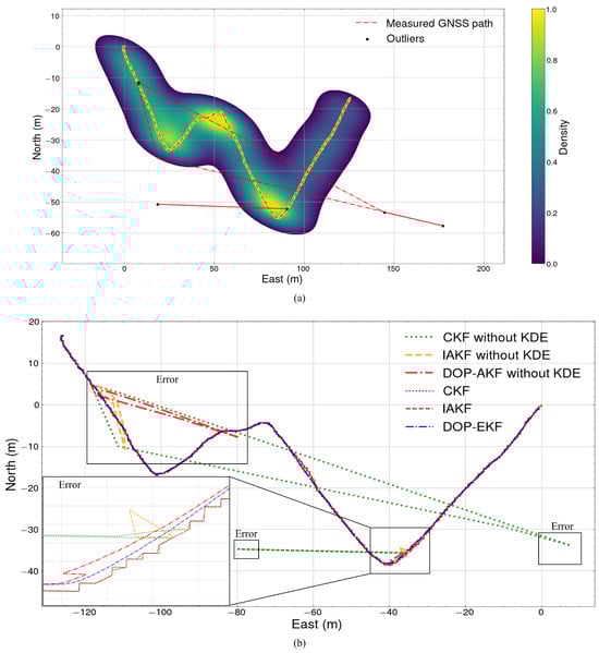 Results of KDE-based outlier removal method: (a) measurement of GNSS path results with outliers; (b) comparison of the KFs [4,16] with and without outlier removal via KDE.