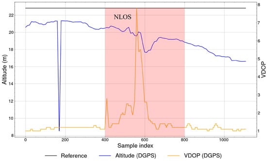 The measured data in Scenario #2 show significant fluctuations both in altitude and DOP values. A correlation between altitude and VDOP values is shown in Figure 9. The measured altitude represented by the blue line is observed to fluctuate by approximately 12 m near the 200-th sample index. Around the 400-th and 800-th indexes, the VDOP, indicated by the orange line, spikes to approximately 8, representing NLOS conditions. Here, the altitude fluctuations are observed to be about 4 m below the reference altitude.