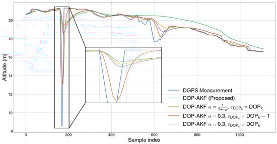 - Scenario #2 analyzes the influence of key parameters that shape the effectiveness of the proposed DOP-AKF: as defined in Equation (14) and as defined in Equation (16). In Figure 7b, the altitude dataset measured in DGPS mode is observed to have rapidly changing altitude values and high DOP values. The DOP analysis for this dataset and the ablation experiment of the main parameters of the DOP-AKF on the positioning accuracy is performed.