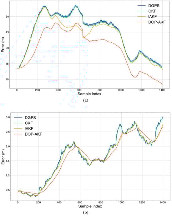 Scenario #3: The performance of the CKF [4], IAKF [16], and DOP-AKF was evaluated for the entire sample index, as shown in Figure 11. The DGPS exhibited an average error of approximately 24 m in comparison to the RTK measurements. This can be attributed to the initial positioning correction of the base, which is presumed to have introduced an error. Given that the DOP values remained below 1.5 throughout the entire dataset, the DOP-AKF is equivalent to filtering for LOS environments. Nevertheless, in a 2D plane, the DOP-AKF shows a 14.52% RMSE improvement compared to the IAKF. At altitude, the DOP-AKF shows an RMSE improvement of 1.69% compared to the IAKF. This indicates that contributed to the performance of the DOP-AKF.