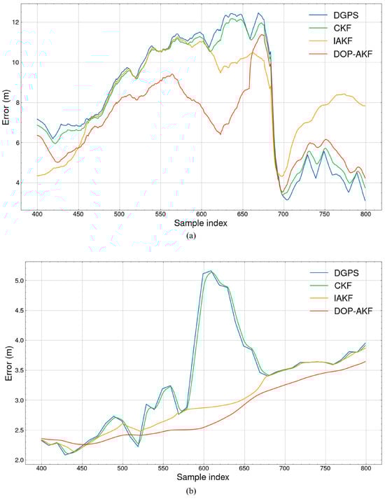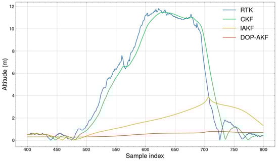 Scenario #4: The filtering results for the 400-th to 800-th sample indexes, which represent the NLOS environment, are shown in Figure 12. The performance of the DOP-AKF is noticeable because the DOP reaches a maximum of about 8 in this interval as shown in Figure 9. Notably, after the 700-th index, the horizontal positioning errors for both IAKF and DOP-AKF become higher than that of the CKF. This error may be attributed to inaccuracies in the RTK mode used as the reference coordinate between the 700-th and 800-th indexes, where it changes from an NLOS to an LOS environment. The RMSE for positioning error shows a performance improvement of 16.38% in the horizontal and 5.69% in the altitude for the DOP-AKF compared to the IAKF.