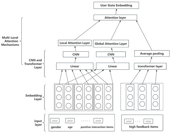The architecture of the user state generation module is illustrated in Figure 1. This module comprises an input layer, an embedding layer, and a multi-layer attention mechanism. The input layer incorporates fundamental user information alongside data regarding positively interacted items, which are subsequently encoded into dense vectors via the embedding layer for advanced processing. Central to the state module is the multi-layer attention mechanism, which encompasses a local attention layer, a global attention layer, and a Transformer layer []. These components work in concert to facilitate a thorough analysis of user interaction data. The local and global attention layers employ convolutional neural networks (CNNs) and linear transformations for feature extraction: the local attention layer is dedicated to examining users’ immediate preferences concerning specific attributes, while the global attention layer addresses interactions among attributes from a more expansive viewpoint, thereby elucidating overarching trends in users’ recent preferences. Furthermore, the Transformer layer evaluates features associated with high long-term rewards, thereby capturing users’ enduring interests. Ultimately, the features derived from both short-term and long-term analyses are synthesized within the composite attention layer to formulate a comprehensive and nuanced representation of the user state. Subsequent sections will elaborate on each component in detail.
