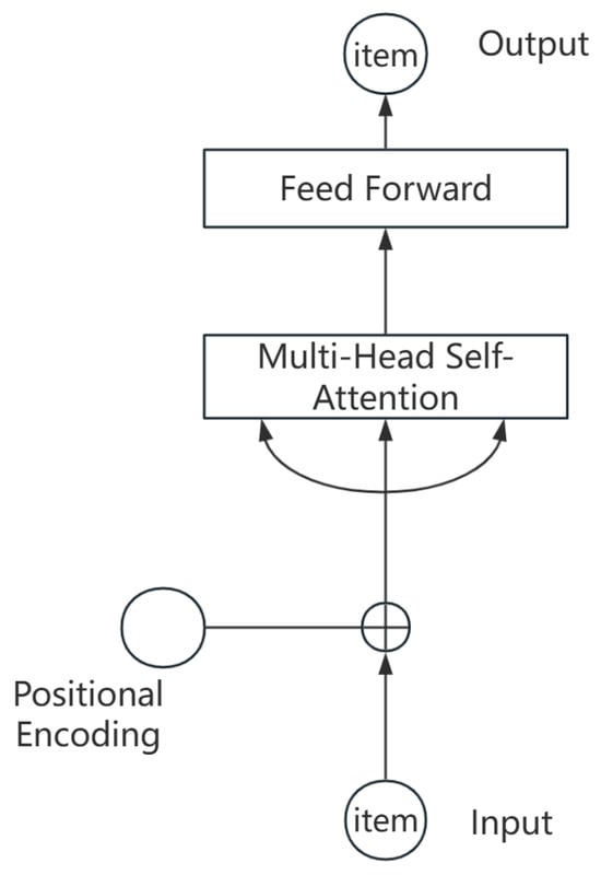 Incorporating all high-reward item features prior to time step t as the user’s long-term preference state I, each item’s feature vector is represented as . These vectors are subsequently input into a Transformer layer for feature transformation. As illustrated in Figure 2, the position encoding of each item is initially defined through an integer sequence and is then mapped to position embedding vectors using a learnable embedding matrix, where k denotes the dimension of the item embeddings. These position embedding vectors are combined with the original feature vectors of the items to produce enhanced input feature vectors . The self-attention layer processes the enhanced feature vectors through three distinct linear transformations to generate the query matrix Q, key matrix K, and value matrix V. The output of the self-attention mechanism is computed as specified in Equation (12).