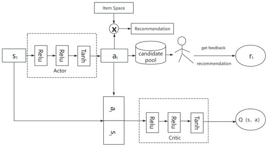 For instance, Zhao et al. [] developed a collaborative filtering algorithm utilizing deep generative adversarial networks, which harnesses reinforcement learning to fully leverage users’ immediate feedback on current recommendations, employing GANs to satisfy RL’s data requirements and optimizing the negative sampling technique. Zhang et al. [] improved the recommendation efficacy in Deep Q-Network (DQN) state representations by incorporating both positive and negative user feedback. Khurana et al. [] utilized a Graph Convolutional Network to generate embeddings for users, items, and sessions, and applied Double Deep Q-Network technology to refine recommendation strategies, effectively addressing overestimation bias while preserving recommendation diversity. Gao et al. [] introduced uncertainty-based weights to penalize unstable Q-values, significantly enhancing long-term user satisfaction in recommendation systems. However, value-based methods that assess Q-values for all potential actions in each state can become inefficient in contexts with extensive action spaces []. To address the challenges posed by large action spaces and facilitate efficient single-step updates, researchers have incorporated the Actor–Critic model into recommendation systems. For example, Liu et al. [] proposed a deep reinforcement learning framework aimed at optimizing interactive recommendation systems, devising four state representation schemes to enhance the learning of recommendation strategies. Xin et al. [] tackled the challenges of absent negative reward signals and temporal dependencies in reinforcement learning for recommendation systems by integrating supervised negative Q-learning (SNQN) with a negative sampling strategy and supervised advantage Actor–Critic (SA2C). Jiang et al. [] introduced a deep reinforcement learning recommendation system (UCSRDRL) featuring user–item state representations, thereby improving recommendation quality through the enhanced modeling of user–system interactions. Padhye et al. [] combined the Actor–Critic framework with the TD3 method, employing convolutional neural network (CNN) layers to capture sequential patterns among documents and achieving low-variance delayed policy updates, which effectively improved document retrieval performance in large action spaces.