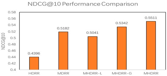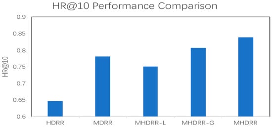 The comparative experimental results are shown in Table 2, Table 3 and Table 4. Across the different sizes of the MovieLens datasets (100 k, 1 M, and 10 M), the MHDRR model consistently demonstrated superior performance, particularly on the larger 1 M and 10 M datasets, where it outperformed all other models in both HR@10 and NDCG@10 metrics. Even on the smaller 100 k dataset, where user–item interactions are relatively limited, the MHDRR model was still able to provide highly accurate recommendations. When applied to the larger 1 M and 10 M datasets, this model significantly improved the generalization capability and accuracy of the recommendation system by effectively utilizing the extensive user interaction data. This highlights the clear advantage of the MHDRR model in handling large-scale datasets and demonstrates its ability not only to predict user interest points more accurately but also to prioritize items in the recommendation list that users are likely to find more appealing, thereby delivering more personalized recommendation results.