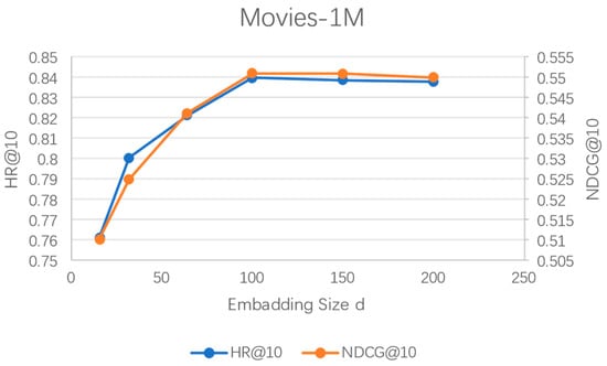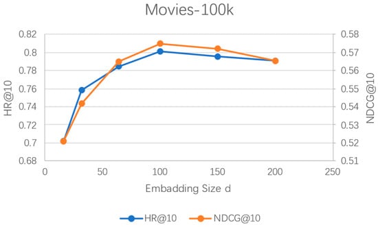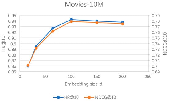 In this study, we explored the impact of embedding dimensions on the performance of the MHDRR framework by conducting experiments on three movie-rating datasets of varying sizes (Movies-100k, Movies-1M, and Movies-10M), with embedding dimensions set at 16, 32, 64, 100, 150, and 200. The experimental results are shown in Figure 6, Figure 7 and Figure 8. The results indicate that as the embedding dimensions increased from 16 to 100, both the hit rate (HR@10) and normalized discounted cumulative gain (NDCG@10) improved significantly across all three datasets, suggesting that higher embedding dimensions effectively capture complex user–item interaction relationships. However, when the embedding dimensions reached 150 and 200, the improvement in recommendation performance began to plateau, likely indicating that the model had reached its learning capacity given the current data, and further increases in embedding dimensions might lead to overfitting and wasted resources. Therefore, based on a balance of performance and efficiency, an embedding dimension of 100 was determined to be optimal, ensuring the best trade-off between recommendation accuracy and computational resource utilization.