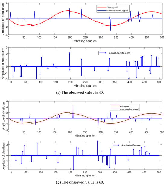 According to the formula for the signal-to-noise ratio (SNR), signal reconstruction can be considered successful when the SNR is positive. The higher the average SNR obtained from the simulation experiment, the higher the probability of successful signal reconstruction. Regardless of the time elapsed, the SNR increases with an increase in the number of observation values. Figure 6, which shows the comparison of reconstructed and original signals and the amplitude difference diagram at t = 1 s for different observation quantities, indicates that within the range in which the number of observation values is greater than 60 and less than 120, the SNR increases rapidly. This suggests that the precision of signal reconstruction significantly improves when the number of observation values is within the range of 60 to 120. After the number of observation values exceeds 120, the probability of successful signal reconstruction remains essentially constant.