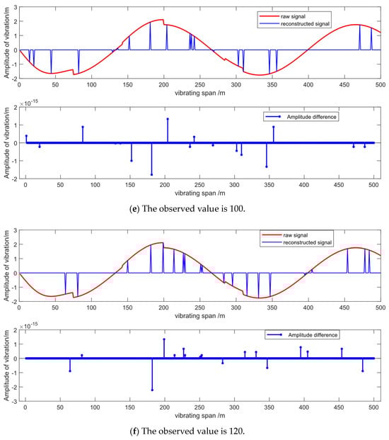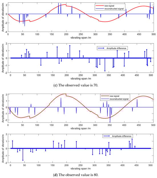 It has been observed that the root mean square error (RMSE) decreases with an increase in the number of observation values, regardless of the time elapsed, as long as the sparsity remains constant. When the vibration time is moderate (t = 1 s or 1.5 s), even with a smaller number of observation values, the reconstruction effect is quite remarkable, with the error being only around 0.125. When t is too long or too short, that is, when the vibration frequency of the galloping curve is too low or too high, the reconstruction effect is relatively poor if the number of observation values is low. However, the overall error remains below 0.35, and the error can rapidly decrease when the number of observation values increases from 40 to 80. When the number of observation values exceeds 70, the error can be reduced below 0.125, ensuring that the accuracy is still guaranteed.