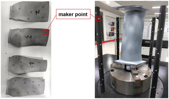 Currently, the part-to-whole registration process often requires maker points to ensure rebuild accuracy. Figure 2 shows two methods for scanning objects with maker points: placing maker points directly on the object, which can result in more or fewer holes on the body of the scene’s point cloud, or placing the object on a fixture table, with pillars being used to attach the maker points, which may prevent the fixed part from being scanned. Both of these methods can result in missing parts in the scene point cloud, which can inevitably impact the results of PCR. This paper focuses on the problem of coarse registration of scene point clouds with missing parts to model point clouds, assuming that multi-viewpoint cloud data have been collected and reconstructed using maker points. The missing parts can be the holes on the body of the blade caused by the maker points or the missing part at the bottom of the blades caused by the fixture design.