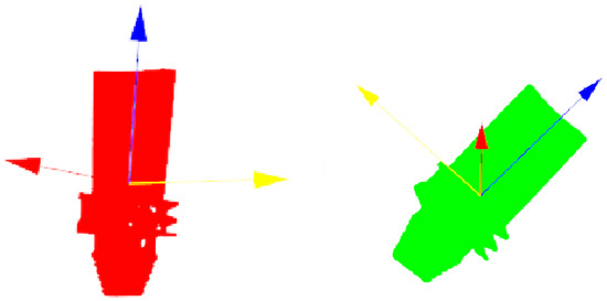 For a point cloud, the location coordinates of every point involve a wealth of information. Instead of dealing with all the information, PCA simplifies the point cloud data by extracting the eigenvalues and eigenvectors of the covariance matrix for the point cloud, i.e., and , where is the eigenvalue of point cloud P and satisfies and is the eigenvalue of point cloud Q and satisfies . Corresponding to , is the eigenvector of point cloud P, as is . Accordingly, we set , , as the z-axis, y-axis and x-axis of point cloud P, respectively, and , , as z-axis, y-axis and x-axis of point cloud Q, respectively. The z-axis represents the direction of the largest variance in the point cloud. Then, the centroid of the point cloud is set as its coordinate origin. Figure 3 is an example of a PCA-computed coordinate axis of a point cloud of the blade. The left is the scene point cloud (rendered in red). The right is the model point cloud (rendered in green). The red axis is the x-axis, the yellow axis is the y-axis and the blue axis is the z-axis.