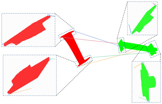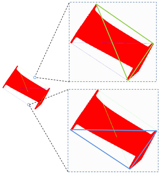 During the measurement process of the blade, marker points are often attached to the blade body in a scattered manner, resulting in no missing holes on the boundary areas of the scene point cloud. Additionally, there are numerous feature points at the boundary of each point cloud that can be used for feature extraction. The location information of these feature points can be utilized to classify and identify the distribution of the point cloud. Based on these factors, keypoints are detected in the boundary areas of the blade point cloud. However, for turbine blades, vertices with similar neighborhood point distributions may cause issues when selecting point pairs. As illustrated in Figure 5, an example of incorrect point pairs can occur when the top keypoints of the scene point cloud (rendered in red) are incorrectly mapped to the bottom keypoints of the model point cloud (rendered in green).